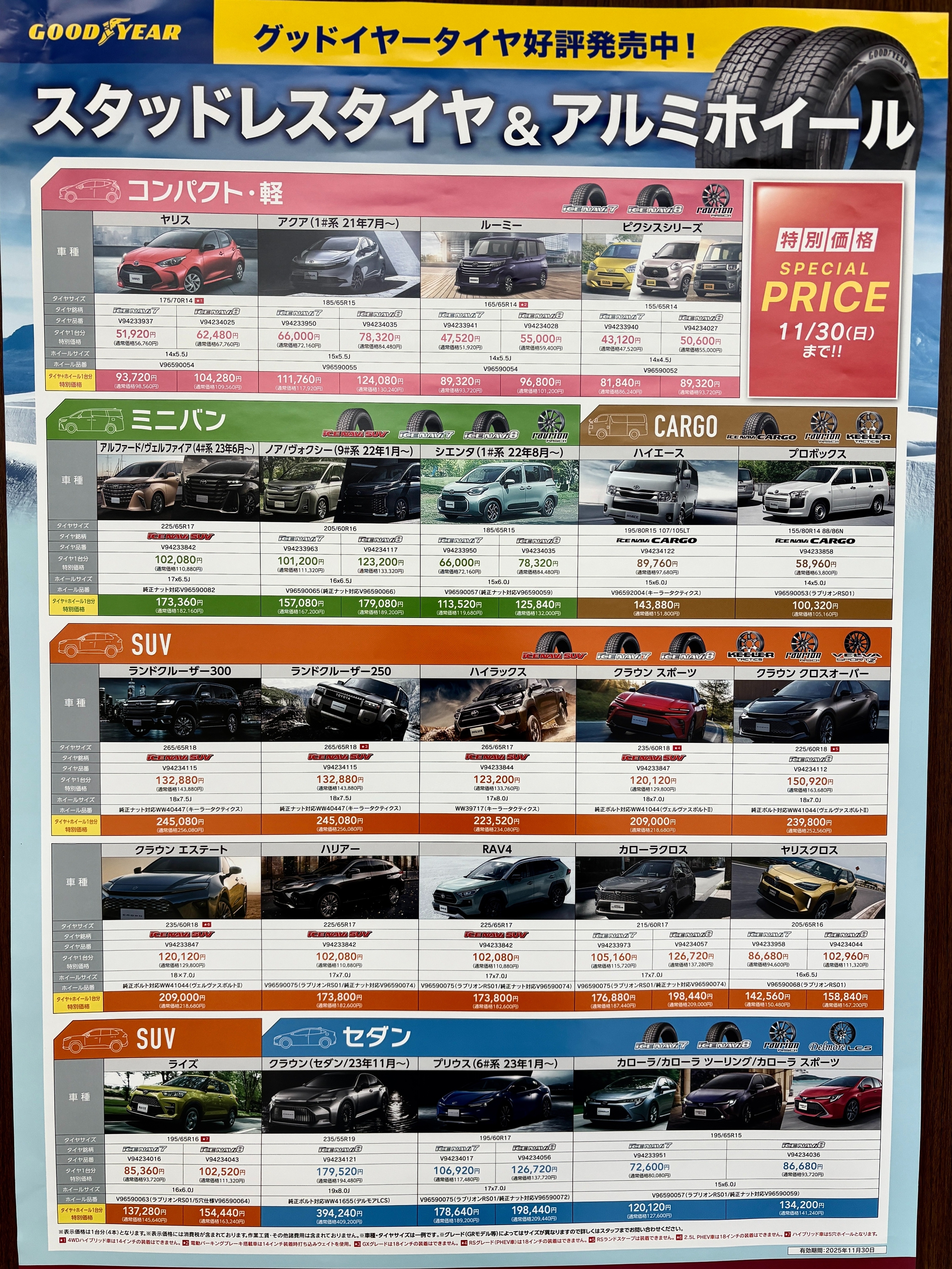 11月30日(日)まで、当社ではグッドイヤーのスタッドレスタイヤ&アルミホイールを特別価格で販売しております😸😸