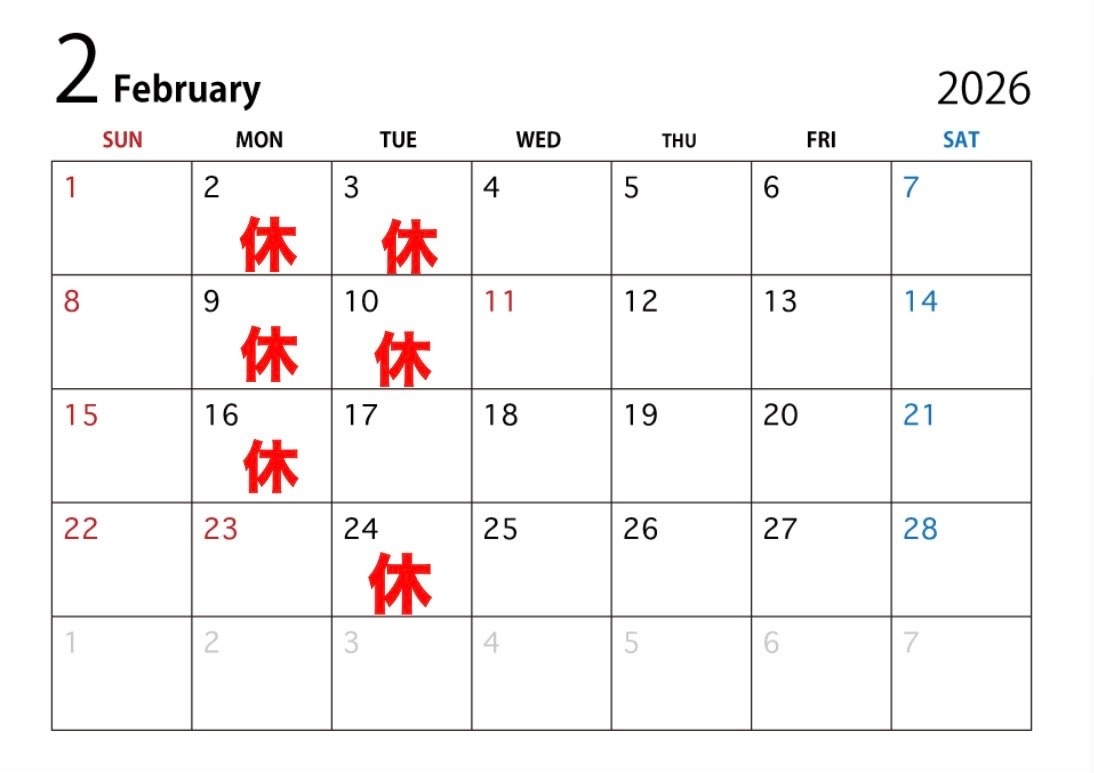 最後に2月の定休日のご案内です。