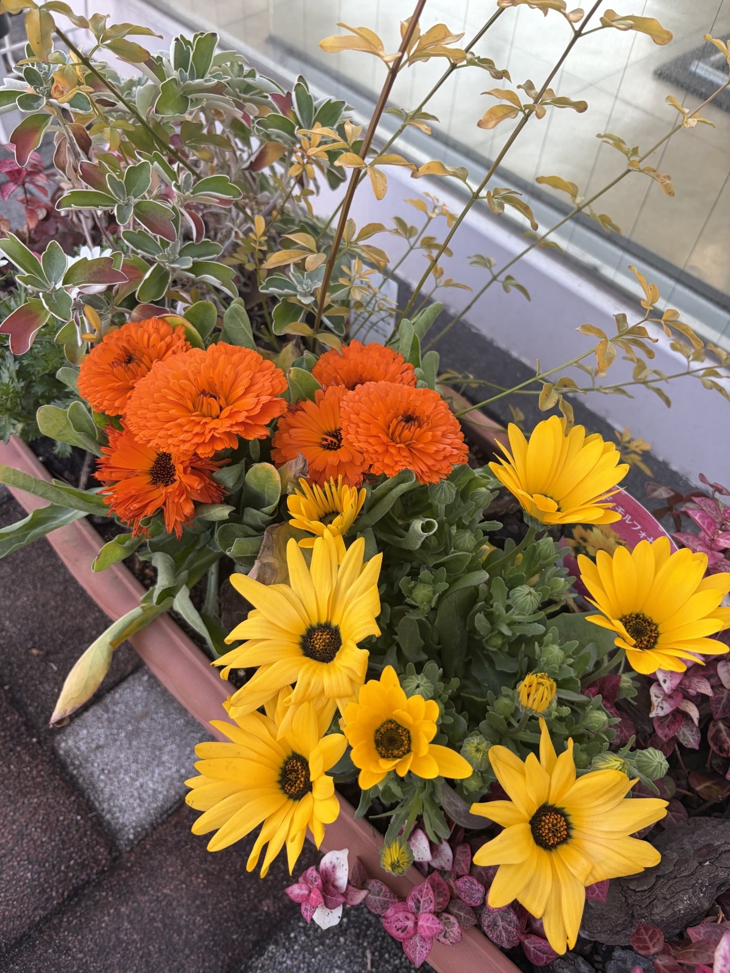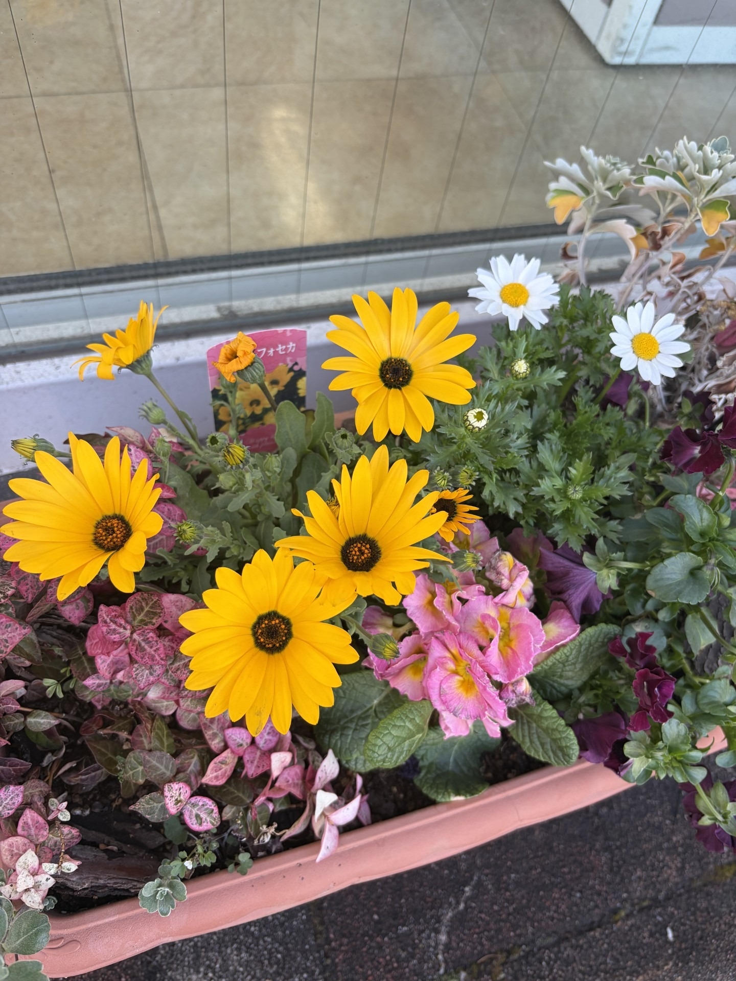 ショールーム入り口のプランターに新しい花を植えてみました🌷